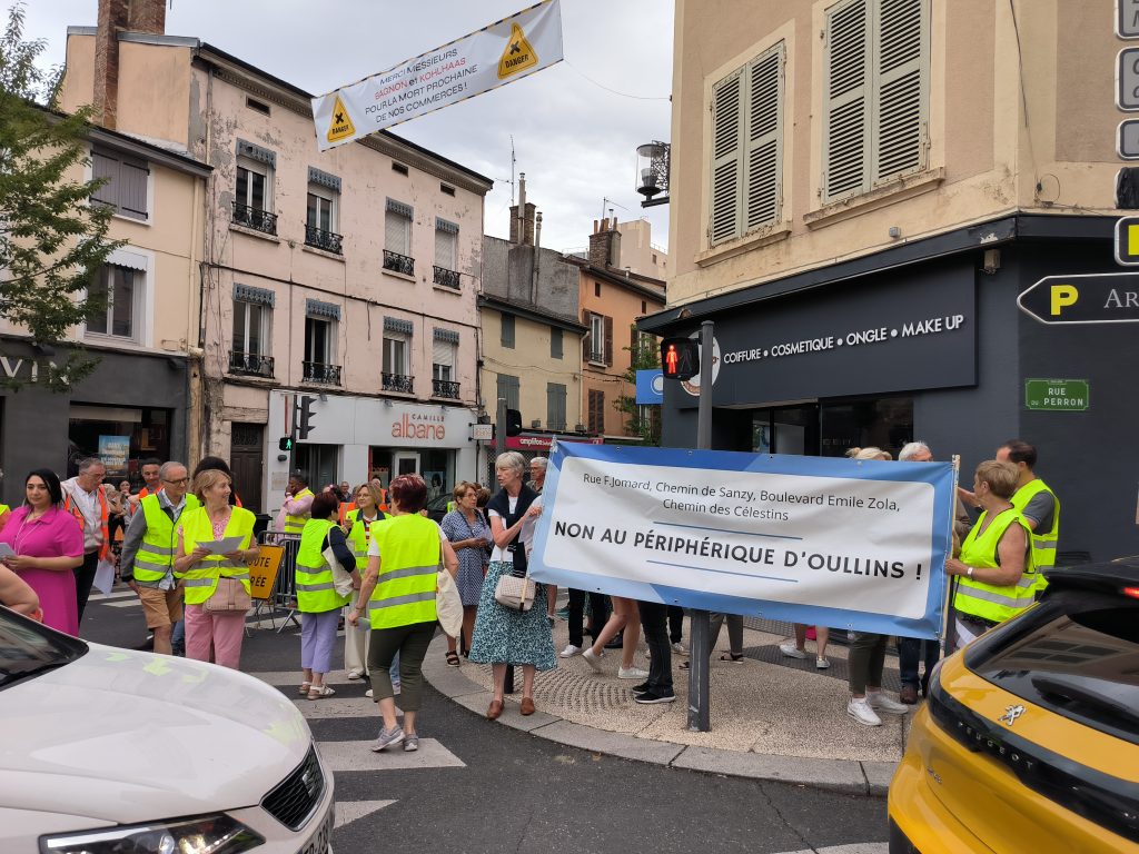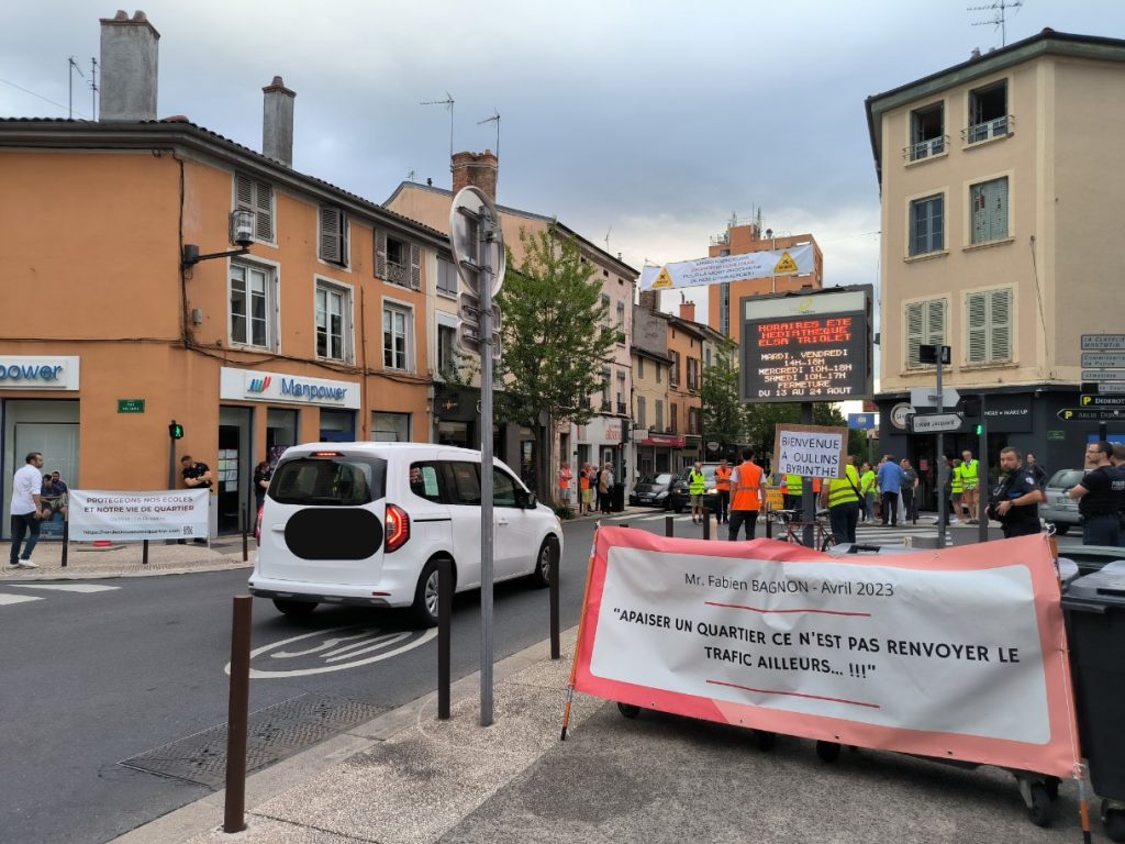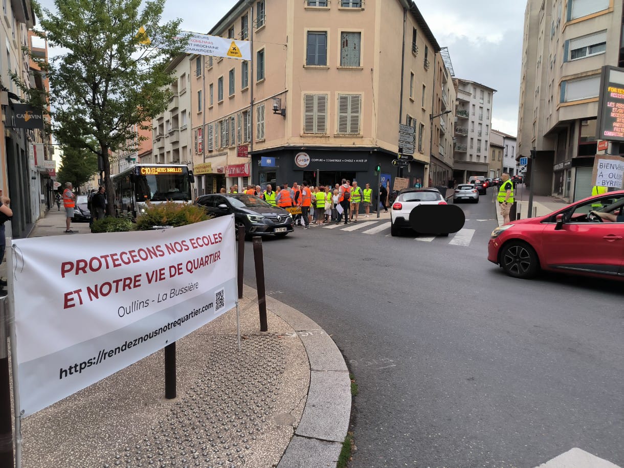Accompagnés des collectifs Passez votre chemin, Santé la Bussière, les commerçants en colère et avec le soutien logistique de la mairie d’Oullins-Pierre-Bénite (notamment pour les barrières), nous avons coupé la Grande Rue en sens Sud-Nord au niveau de la rue du Perron ainsi que la rue Raspail pour ne pas que les voitures récupèrent la Grande Rue dix mètres plus bas.